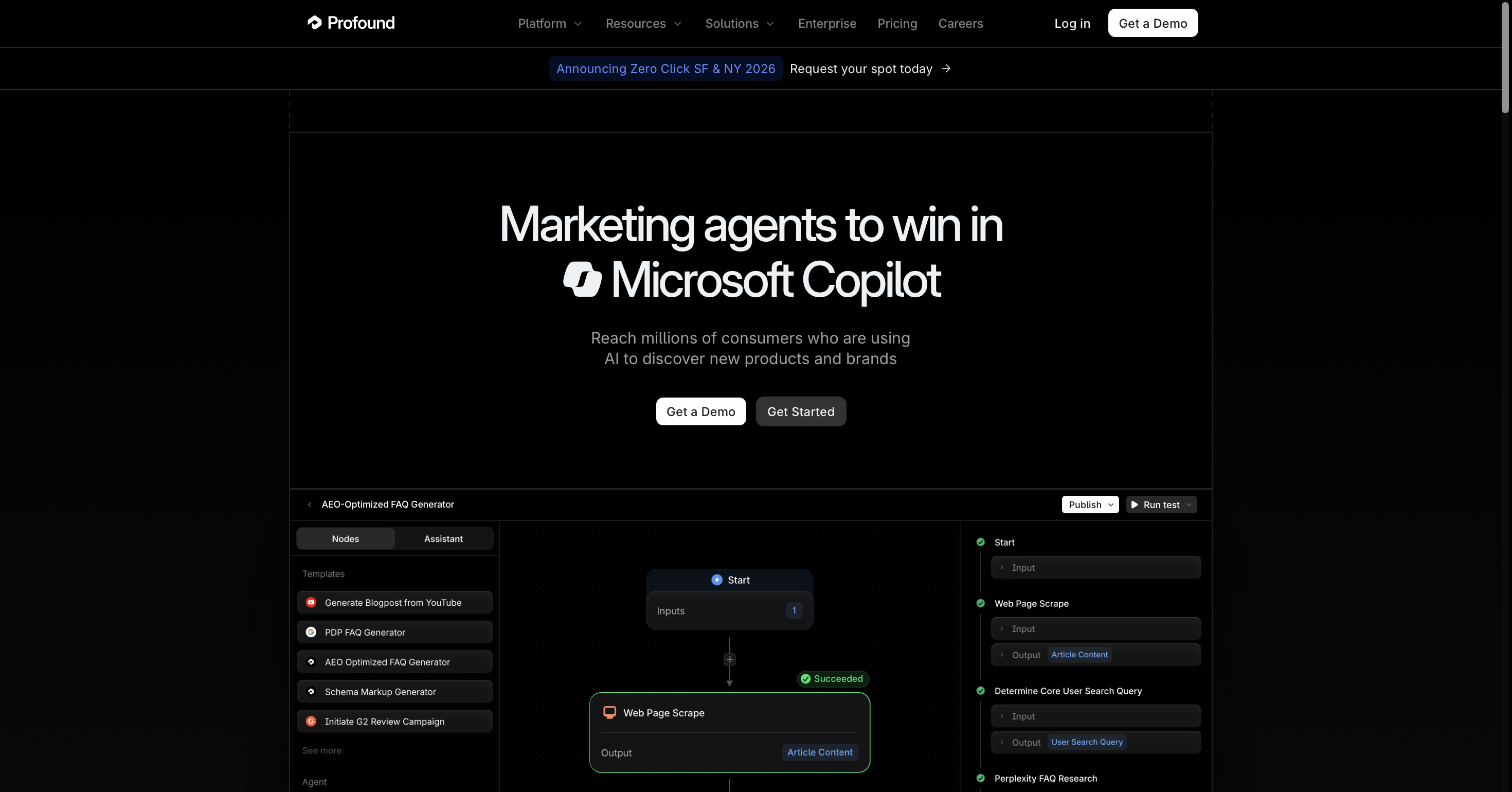 Profound is the G2 Winter 2026 AEO Category Leader and the platform of choice for enterprise brands like MongoDB, Ramp, and Figma. Its scale is genuinely different: 10+ AI engines tracked, 400M+ real user prompts surfaced through its Conversation Explorer, and an Agent Analytics feature that shows how AI crawlers access your content.