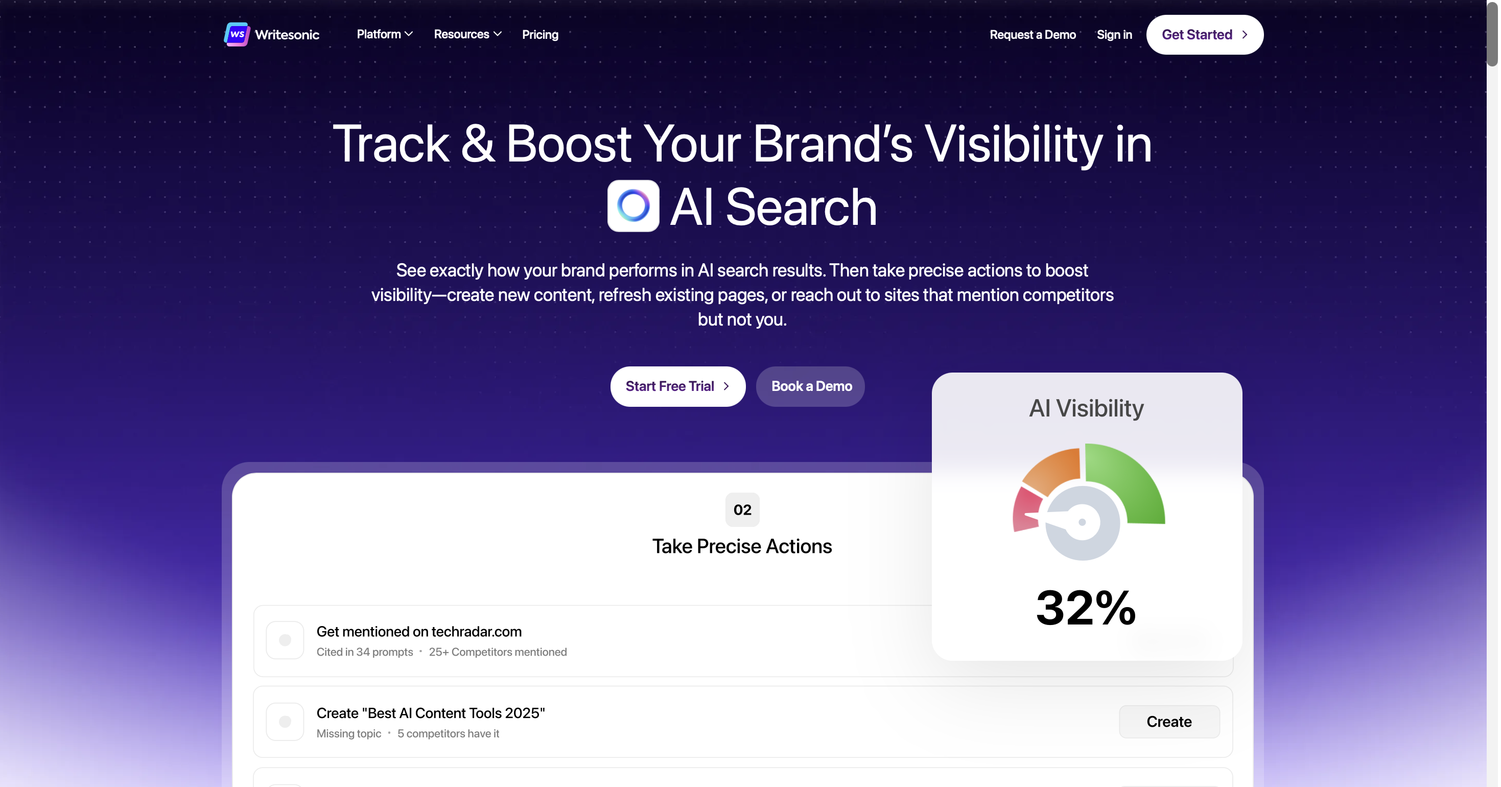 Writesonic took a different strategic bet than most GEO platforms: instead of building a pure monitoring tool, it built the tracking and the fix in one subscription. Its Brand Presence Explorer tracks where you appear (and where you don't) across ChatGPT, Gemini, Perplexity, and Google AI Overviews — then its content creation suite lets you immediately draft and publish AEO-ready content to close those gaps.